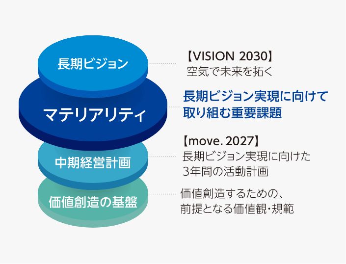 当社グループでは、ESG活動の各種取り組みを2021年にESGマテリアリティおよび具体的なアクションプランにまとめて整理し、PDCAサイクルを回して活動してまいりました。しかし、社会情勢や経済構造が変化する中で長期的な企業価値の創造には、より進化したマテリアリティに基づく戦略が必要不可欠です。そこで、より広い視野で経営課題を認識するため、長期ビジョン「VISION 2030:空気で未来を拓く」および中期経営計画「move.2027」を踏まえて、新たにマテリアリティとして整理しました。経営計画の見直しなどのタイミングに合わせて適宜必要な見直しを行ってまいります。