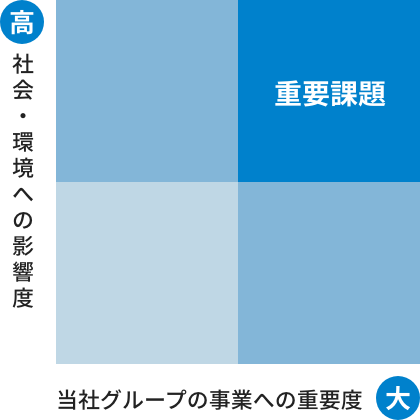 - 抽出した課題に対し【社会・環境への影響度】【当社グループの事業への重要度】を審議し、重要性を評価